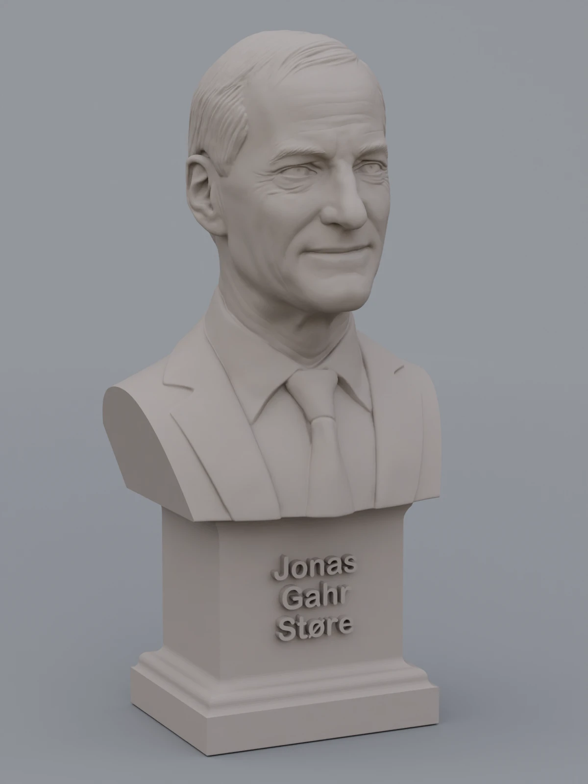 A traditional-style bust of Jonas Gahr Støre on a plinth pedestal. The plinth's front has a large name plate.