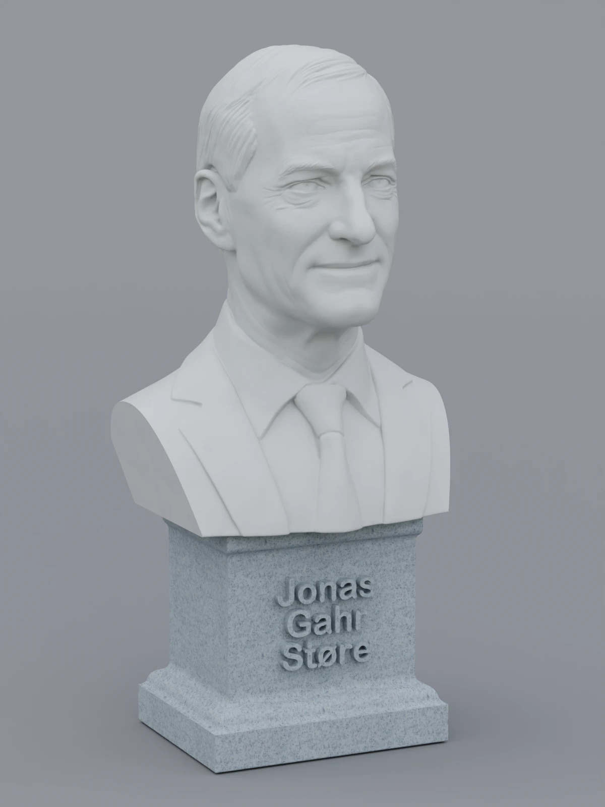 A traditional-style bust of Jonas Gahr Støre on a plinth pedestal. The plinth's front has a large name plate.