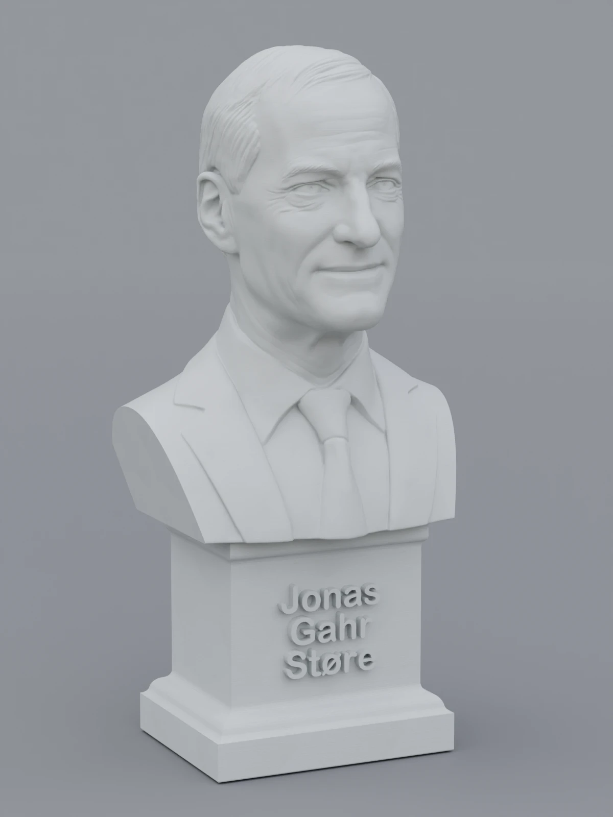 A traditional-style bust of Jonas Gahr Støre on a plinth pedestal. The plinth's front has a large name plate.