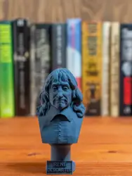 A traditional-style bust of René Descartes on a column pedestal. The bottom of the pedestal has a name plate.
